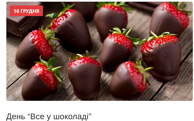 День “Все у шоколаді” відзначається 16 грудня, придумане у США — це свято шоколадної творчості та смаку. Це день, присвячений безмежним кулінарним можливостям шоколаду. Це оригінальне свято заохочує любителів шоколаду досліджувати й насолоджуватися універсальністю шоколаду, в який можна вкрити практично все, що тільки можна собі уявити.